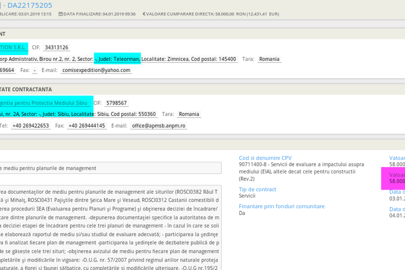 58.000 de lei plăteşte APM Sibiu firmei unui fost consilier judeţean din Teleorman, pentru studii de mediu, aflăm de pe pagina de Facebook - ”Banii noștri Sibiu”.