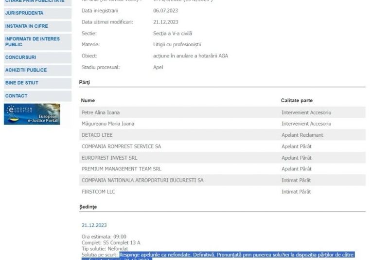 Avocatul Veronel Rădulescu a declarat că judecătorii de la Curtea de Apel București au decis că numirea Consiliului de Administrație Romprest a fost nelegală. Motiv pentru care, de azi, compania nu mai are Consiliu de Administrație și revine la situația juridică anterioară. Decizia este definitivă.
