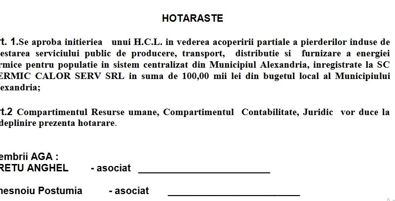 Societatea menită să țină în viață sistemul centralizat care încălzea cândva toată capitala Teleormanului, SC Termic Calor Serv SRL, mai ”face” municipalitatea Alexandriei de niște bani. Deși, în zilele noastre, Termic Calor Serv mai servește câteva zone defavorizate din Alexandria, primăria încă îi dă bani, așa cum procedează de mulți ani de când societatea ”funcționează” pe pierdere. În acest sens, Consiliul local Alexandria are un proiect de hotărâre în vederea acoperirii parțiale a pierderilor induse de prestarea serviciului public de producere, transport, distribuție și furnizare a energiei termice în sistem centralizat. TERMIC CALOR SERV SRL vrea suma de 100,00 mii lei din bugetul local al municipiului Alexandria, după cum au decis membrii din AGA.