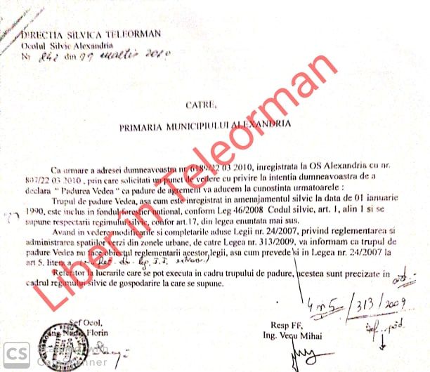 și dacă se urmărește schimbarea categoriei de folosință a unor suprafețe și efectuarea unor lucrări specifice, considerăm că acest lucru este posibil numai printr-o scoatere definitivă a suprafeței căreia i se schimbă destinația. Primăria a solicitat punctul de vedere privind declararea pădurii Vedea ca pădure de agrement, cu păstrarea regimului silvic, fiind informată că suprafața se supune regimului silvic.”