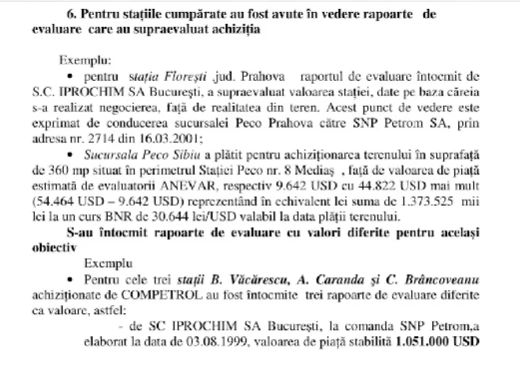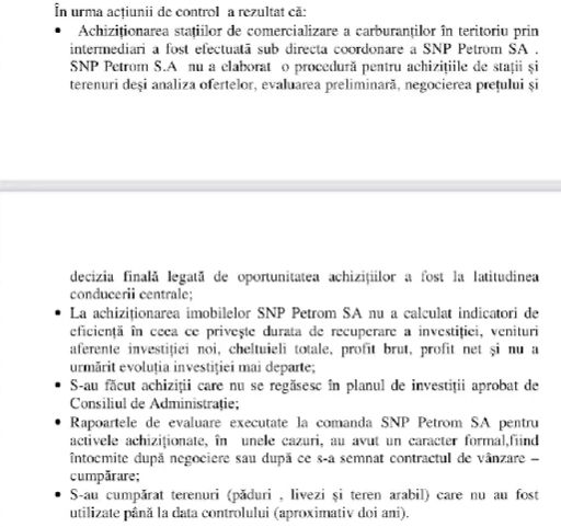 Compania Petrom a cheltuit sute de miliarde de lei pentru benzinării și terenuri supraevaluate! O spune un raport al curții de conturi întocmit înainte de privarizare. În plus, în urma unor controale realizate în anul 2003, la circa 20 de statii Peco, s-a constatat că SNP Petrom SA nu a elaborat o procedură pentru achizițiile de stații și terenuri. Astfel, mai mult de 200 miliarde de lei au fost gestionate după bunul plac al conducerii societății din acea perioadă.