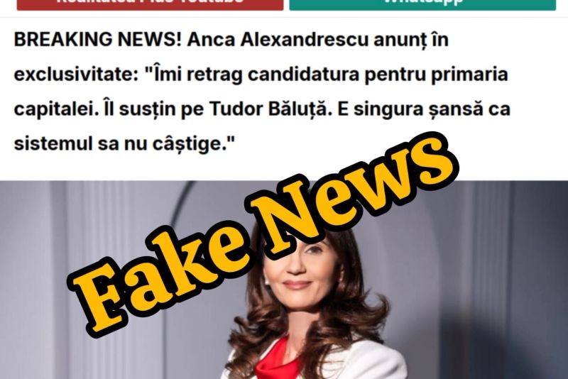 Candidata independentă Anca Alexandrescu și realitatea.net sunt victimele unui fals grosolan, promovat pe rețeaua X. O imagine capturată de pe un site care a copiat identitatea grafică realitatea.net prezintă presupusul anunț că Anca Alexandrescu a decis să se retragă din cursa pentru primărie și chiar recomandă susținerea unui alt candidat.